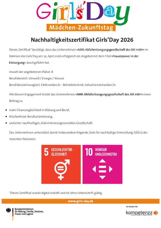 Am Girls´Day, dem bundesweiten Aktionstag zur klischeefreien Berufs- und Studienwahl, waren unter dem diesjährigen Motto „Dein Tag, Dein Weg!“ wieder interessierte Mädchen im Iserlohner Müllheizkraftwerk zu Gast.